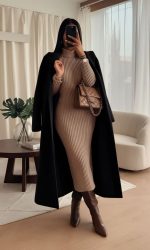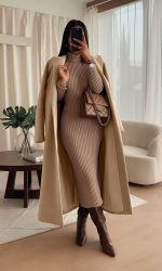 فستان تريكو ضيق بلون بيج وقصة جسم أنيقة، مع بالطو طويل بنفس التناسق. لبس خروج حريمي شيك ومثالي للشتا، ينفع للجامعة، الشغل أو الخروجات. موضة 2025 وتقدري تشتريه أونلاين في مصر بسهولة.